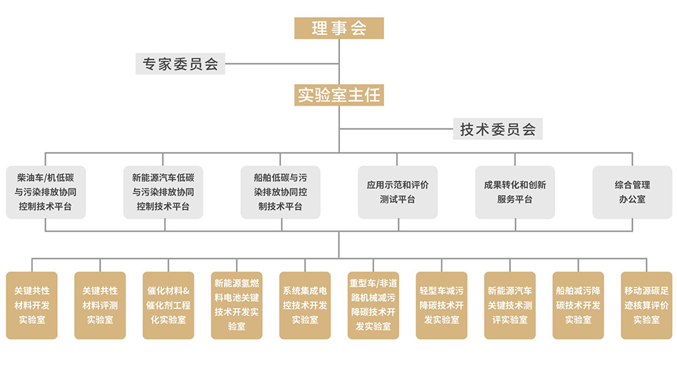 实验室实行理事会领导下的实验室主任负责制,设立专家委员会和技术委员会。针对汽油车、柴油车、新能源汽车和船用柴油机的低碳与污染排放协同控制形成三条纵向的研发平台,贯穿这三条技术主线,建设横向的“应用示范和测试评价”和“成果转化和创新服务”平台,构建三纵两横的总体布局。为了支撑服务“三纵+两横”五个平台的运行,集中建设十个关键技术开发实验室,并针对一些相对独立且关键的技术领域设立若干技术中心。