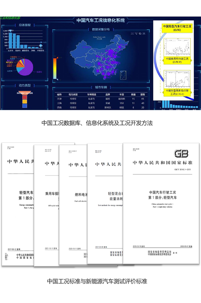 实验室牵头行业开展了中国汽车行驶工况(简称中国工况)的研究和应用,形成了以中国工况为核心特征,覆盖基础应用、试验方法、限值和标识的汽车节能标准体系,并以中国工况标准为延伸,建立了完整的新能源汽车测试评价标准体系。提出了能耗-驾驶模式解耦检测与评价方法、不同应用场景下的动力电池寿命测试方法,主导制定中国工况及新能源汽车相关国际标准2项、国家标准30余项、行业标准20余项。相关成果获得省部级科技进步特等奖1项、一等奖1项、二等奖2项,省部级专利金奖1项、优秀奖1项。